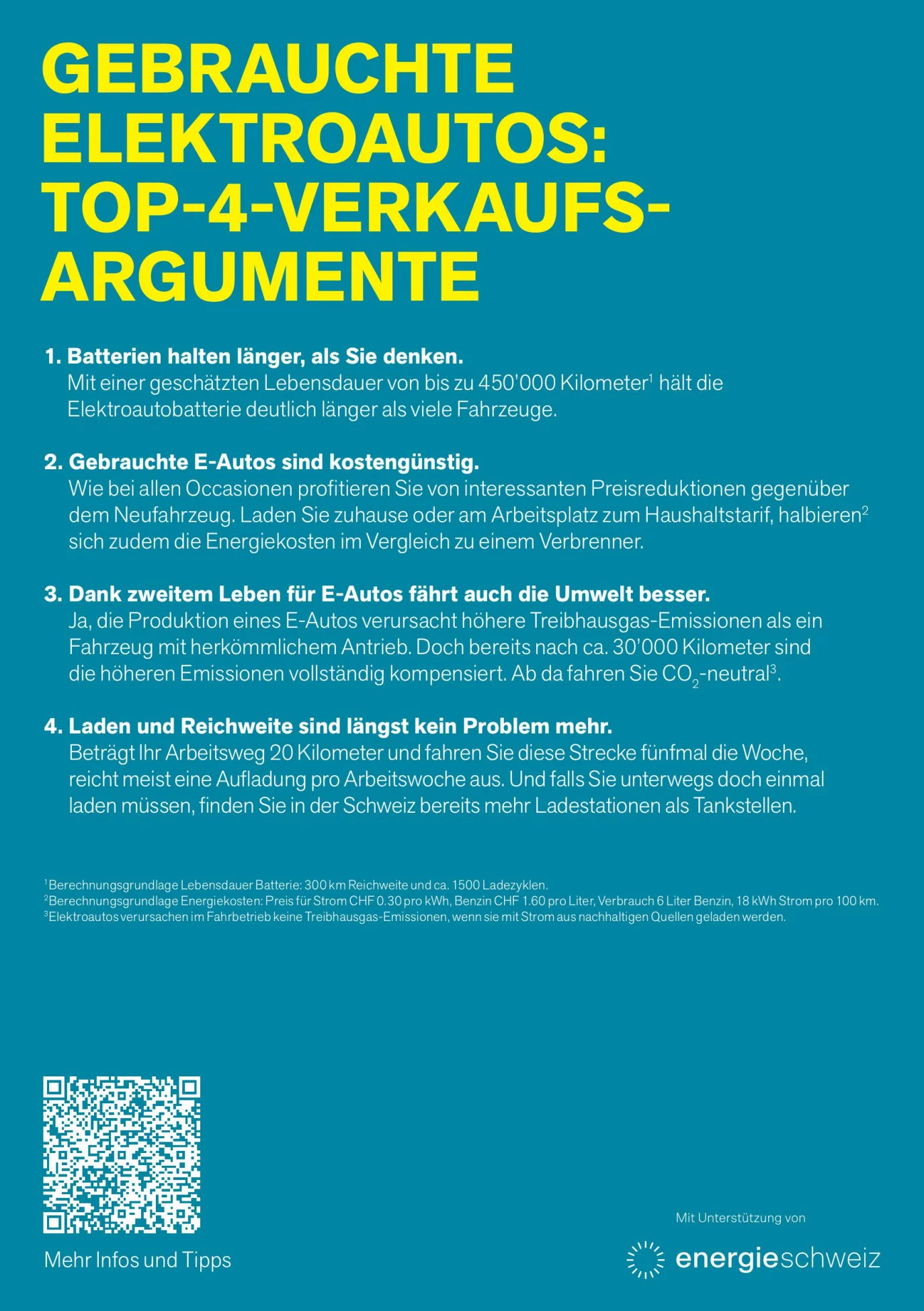 Die E-Occasionen-Kampagne macht auf die Vorteile gebrauchter Elektrofahrzeuge aufmerksam und stärkt gleichzeitig die Position der AGVS-Garagenbetriebe als kompetente Ansprechpartner rund um die Elektromobilität.