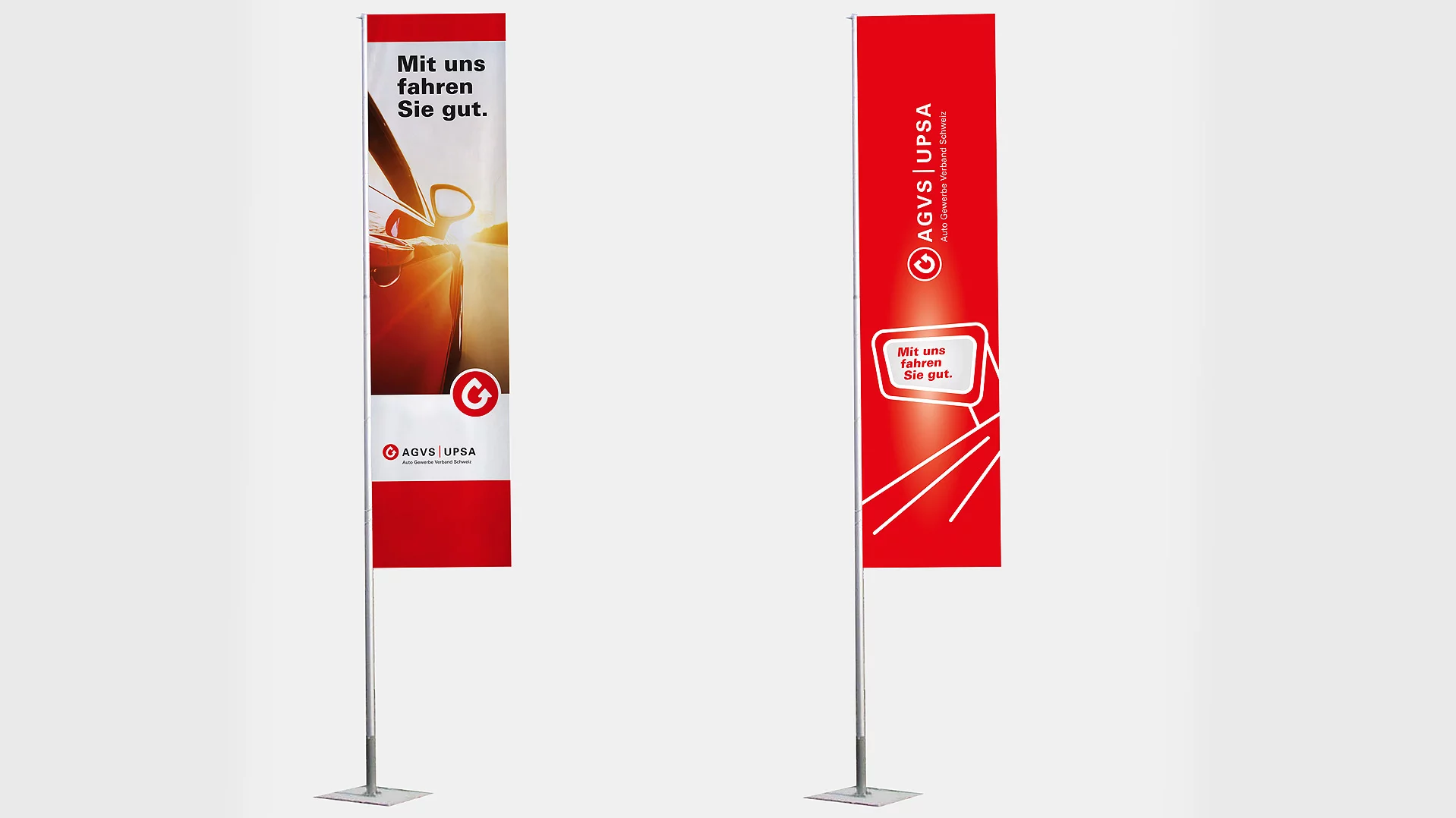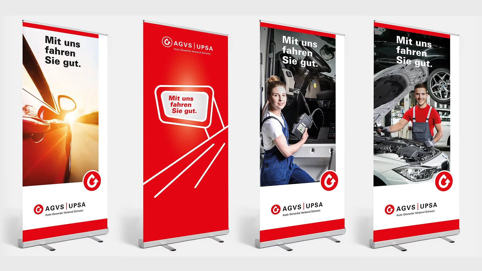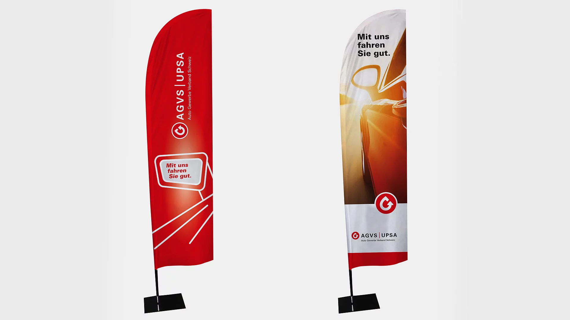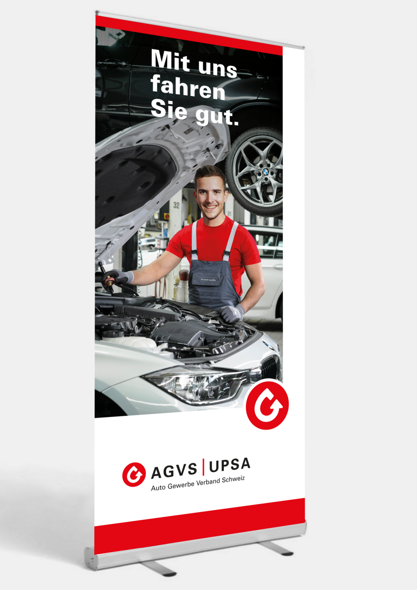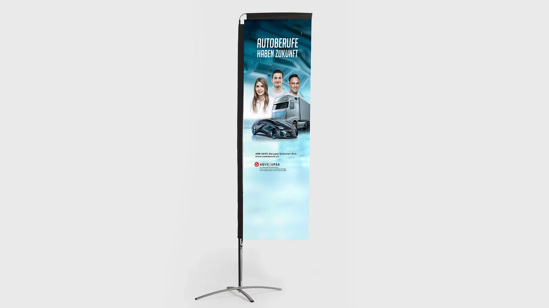 Damit Ihre Sektion oder Ihre Garage an der nächsten Regional- oder Berufsmesse jeder Besucherin und jedem Besucher sofort ins Auge sticht und einen positiven und vor allem auch bleibenden Eindruck hinterlässt, hat der AGVS auch die passenden Roll-ups, Beachflags sowie Messwände im Angebot.